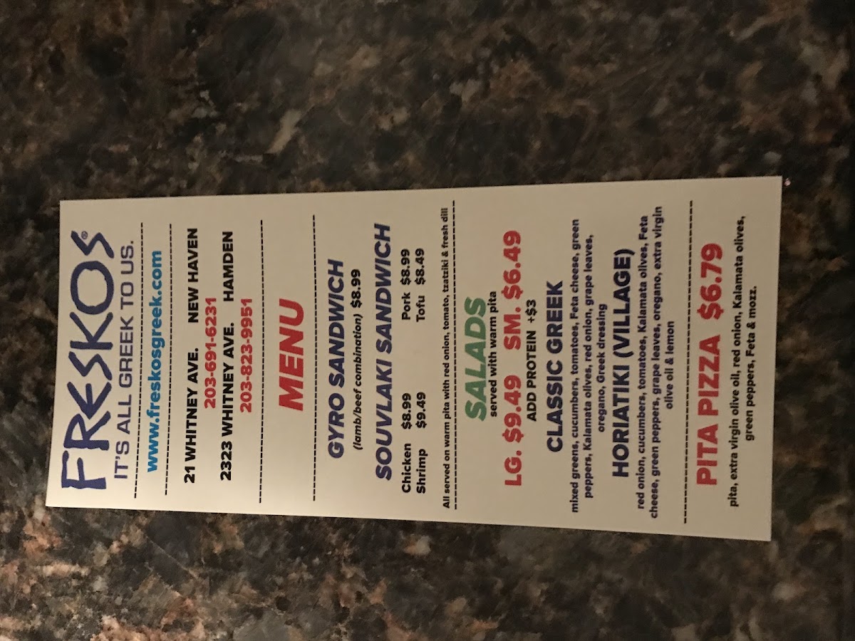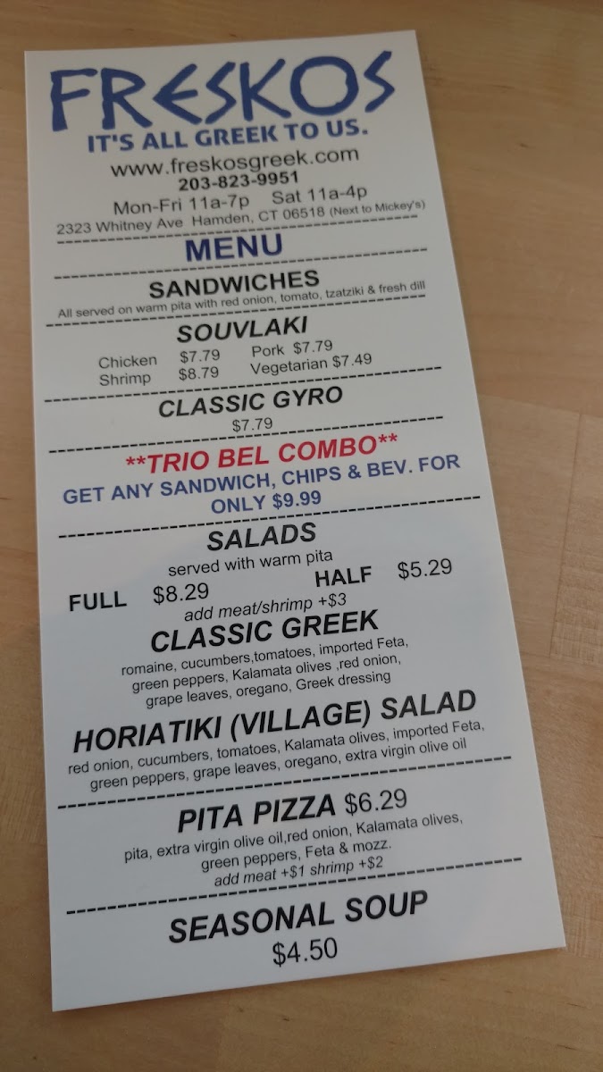 Overall, Freskos Hamden’s menu provides a comprehensive Greek dining experience, offering something for everyone, from classic sandwiches to fresh salads, savory dips, and indulgent desserts, all served with a warm Mediterranean flair.